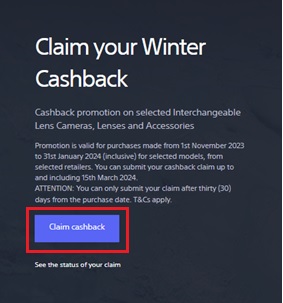- På kampanjens webbplats klickar du på den blå knappen för anspråk (t.ex. Claim cashback (anspråk på cashback)).