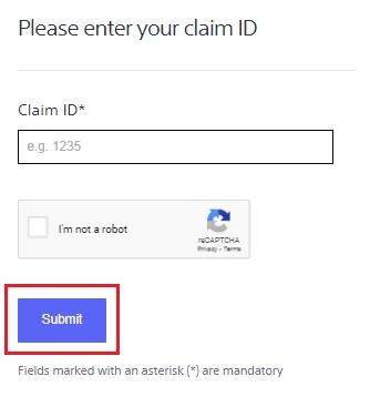 - På sidan Claim Status (status för anspråk) fyller du i det Claim ID (anspråks-ID) som finns i bekräftelsemeddelandet och väljer [Submit] (skicka).