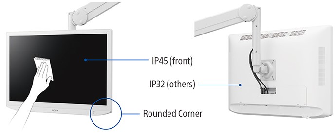 Monitorns smala ram och rundade hörn förenklar integreringen i operationssalen, medan den släta ytan och den strömlinjeformade baksidan gör den lätt att torka av och hålla ren. Monitorns motståndskraft mot inträngande vätska och fasta partiklar, med IP45 (fram) och IP32 (bak) dammtät och stänksäker klassificering, gör den ännu bättre lämpad för medicinska anläggningar.