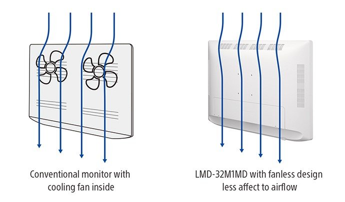 LMD-32M1MD är utformad med användarvänlighet och vårdtillämpningar i åtanke. Den imponerande fläktlösa designen minskar störningar av luftflödet från ventilationen runt bildskärmen.