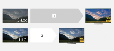 En HLG (Hybrid Log-Gamma) HDR-bildprofil, komplett med det bredspektrade BT.2020-färgomfånget, kan användas för direkt HDR (HLG)-uppspelning på kompatibla TV-apparater. Resultatet är verklighetstrogna bilder som ligger nära vad man kan se med blotta ögat, med detaljerade skuggor och högdagrar, minskning av alltför mörka eller ljusa områden, och utan behov av färgnyanser. I synnerhet 10-bitars inspelningar återger verklighetstrogna nyanser och detaljrikedom. [1] Hög flexibilitet att finjustera bilder efter behov (färggradering krävs) [2] Direkt bild med hög kvalitet (färggradering krävs inte)