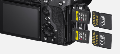 Kamerans två medieplatser är kompatibla med de nya CFexpress Type A-korten samt SDXC-/SDHC-kort med stöd för hastighetsklasserna UHS-I och UHS-II. CFexpress Type A-kort är nästa standard för kompakt lagring med hög läs-/skrivhastighet, lämpliga för både kontinuerlig stillbildstagning i hög hastighet och 4K-filminspelning i höga bithastigheter. De kan snabbt rensa kamerans buffertminnen även när stora volymer stillbilder och filmdata genereras.